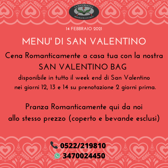 San Valentino 2023 … Puoi Festeggiare in anticipo riservando il menù anche nei giorni di Sabato 11 e Domenica 12 IMPORTANTE!! Si prega di comunicare eventuali disdette SOLO telefonicamente onde consentire un rapido rimpiazzo del tavolo.